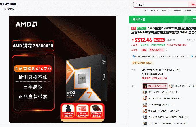 政府补贴新史低价!AMD 锐龙7 9800X3D游戏神U推荐