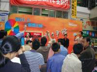 在整场活动中,不但舞台周围站满了人,四周的阳台上也探出很多脑袋,大家对这次活动都蛮热心的。电脑城旁边的那些专门为客户背运货物的人也饶有兴趣的观看这场活动,在电脑城门口,可以看到很多背上背着个篓的人,他们都是为那些商家搬运货物的。