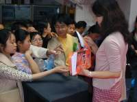 活动开始了,工作人员在向观众发抽奖券,哇,大家都在抢哇,这么热心。