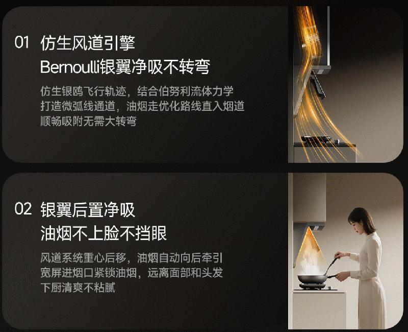 这意味着,用户从此告别“迎着油烟炒菜”的尴尬。即便是爆炒辣椒,也能全程保持清爽。该技术实现了油烟在产生瞬间就被锁定,并沿近乎直线的路径迅速排出,真正做到了“美学与性能的共鸣”——在超薄艺术化的机身之中,蕴藏着超越传统的强劲吸力。