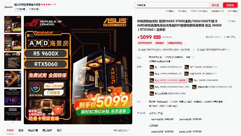 首先是这款华硕游戏整机,在处理器的选择上主要是以AMD锐龙5系列处理器,最高可选锐龙5 9600X这款人气极高的性价比游戏神U,主板和显卡可选华硕各种非公版产品,配备的机箱是华硕星辰无立柱海景房,搭配RGB风扇之后可以让主机的灯光效果拉满。目前这款整机正在限时3C百亿补贴中,晒单赠大额现金红包,还有机会赢取哈曼卡顿级音箱。