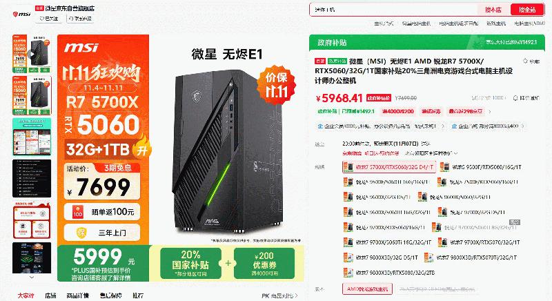 最后这款微星整机可选性极高,可以说AMD爆款锐龙处理器全家桶都可以选择到,搭配的主板和显卡都是来自微星科技的非公版产品,内存和SSD均可以按照用户们的需求进行加购升级,机箱采用的是高效散热的微星无烬E1。目前这款整机享受20%国补,还有优惠券可以领取,三期免息晒单还返E卡。