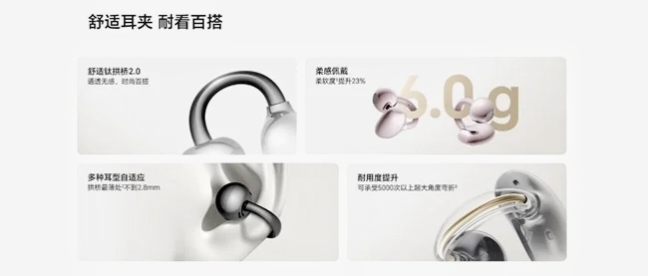 荣耀耳夹耳机2 Pro 搭载全新舒适钛拱桥 2.0,单只耳机仅重6g,耳机拱桥内置记忆钢丝与钛合金材质,柔软度提升23%,质感软弹,对耳朵的物理压力更小,拱桥最薄处不到2.8mm,为不同耳型预留更宽裕的适配空间,无论耳型大小均能实现精准贴合,全新耳机人体工学设计,耳机表面曲度经过优化,面积大幅增加,保障佩戴贴合度的同时,带来更舒适透气的佩戴体验,达到了耐用性和佩戴舒适性的完美平衡。