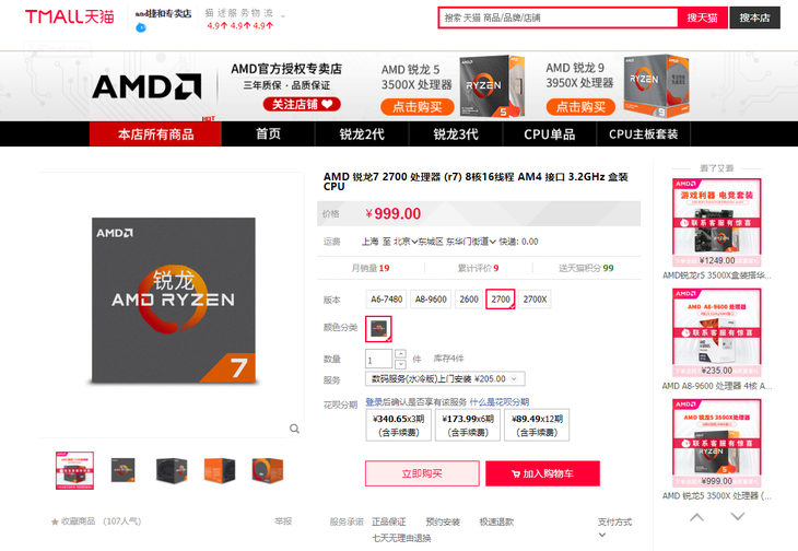 目前这款AMD锐龙7 2700在天猫的售价仅为999元,不到千元的价格,却有着8核心16线程的高规格配置,这在目前的千元级市场中可以说是独一无二,超高的性价比配合强劲的性能,也让这款处理器成为了热爱电竞玩家的首选,您还在等什么呢,让这款千元游戏神器助您回归守望战场吧!