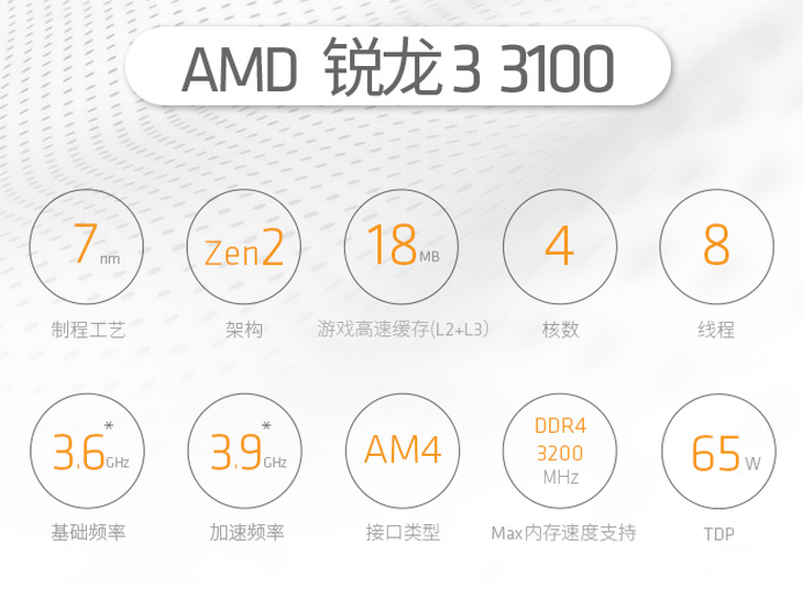 虽然是一款入门级产品,但 AMD锐龙3 3100同样采用了7nm制程工艺以及Zen2核心架构,4核心8线程的配置,3.6GHz的主频以及高达 18MB的游戏高速缓存,也为这款产品的办公和游戏性能提供了良好保障。无论是日常的办公软件,或是热门的主流电竞游戏,AMD锐龙3 3100都可以流畅运行,为您带来高效的办公效率以及良好的游戏体验。