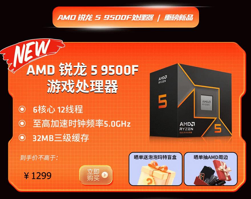 5力全开!AMD 锐龙5 9500F处理器现已正式开售