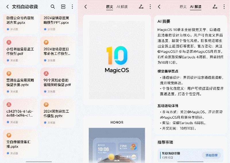 据内测用户在公共领域的讨论,升级至MagicOS 10后,系统新增十余项AI功能。其中作为专属个人知识库的 “YOYO记忆”的升级尤为亮眼。升级后的YOYO记忆在原有收藏空间基础上,支持“随心记”、“安心管”、“贴心用”,化身更全能的随身助理,帮助用户提升信息存储、编辑、管理效率。