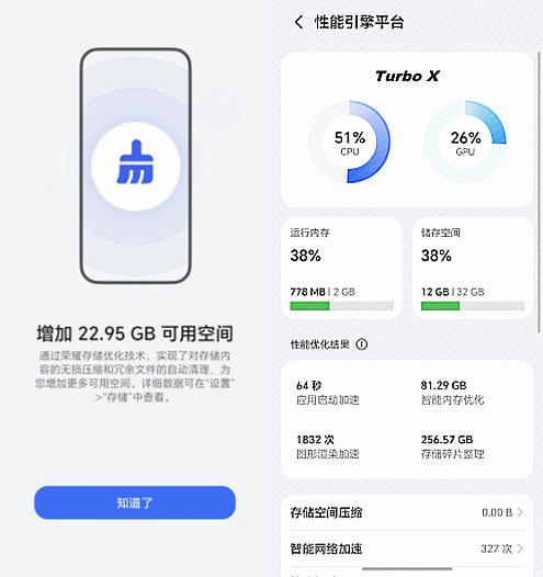存储优化方面,荣耀MagicOS 10升级无损压缩引擎,根据文件类型特征及文件数据分布特征,自适应不同的无损压缩算法与参数,使存储空间利用率最高提升10%,在无需额外清理用户数据的情况下实现系统空间瘦身。用户升级系统后,最多可释放50GB可用空间,还可在设置中新增的“Turbo X性能引擎平台”查看优化效果,告别存储焦虑。