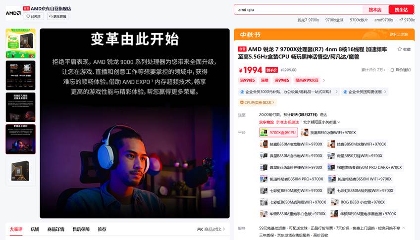 已破2000元!AMD 锐龙7 9700X处理器黄金周超值推荐