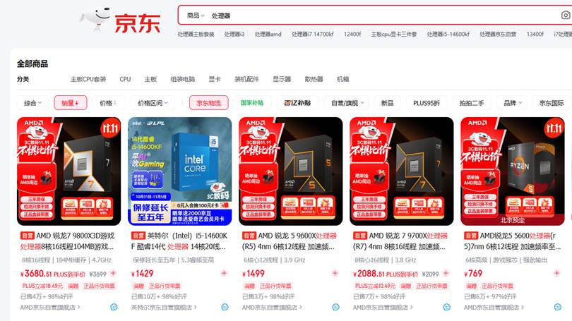 大家只要京东商城搜索“处理器”,选择京东自营产品按照销量排列就一目了然了,来自AMD(超威)的锐龙9 9800X3D成为了这个11.11大促高潮期最卖座的处理器,对于游戏玩家来说这真的是众望所归了,这款被DIY玩家们奉为“游戏神U”的产品就是目前游戏性能天花板级别的处理器,想拥有极致游戏体验的玩家们是绝对不能错过的,下面就为大家再来详细介绍一下这款“销冠”。