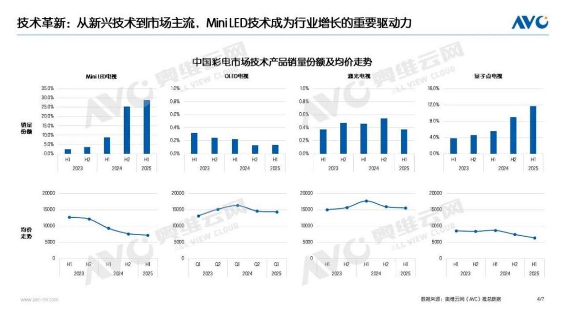 当前,全球Mini LED电视市场正处于爆发增长期。据Omdia统计,2025年上半年全球Mini LED电视出货量达480万台,同比激增150%,中国市场增幅超200%,全年全球出货量预计突破1139万台。奥维云网(AVC)推总数据同样显示,2025上半年彩电市场Mini LED电视销量渗透率大幅增长至29%,销量同比增长超2倍。由此可见,无论是从市场份额还是规模增速上看,Mini LED无疑都已成为彩电市场成长性最为良好的细分赛道,是2025年电视技术发展的主流方向,也是行业增长的重要驱动力。