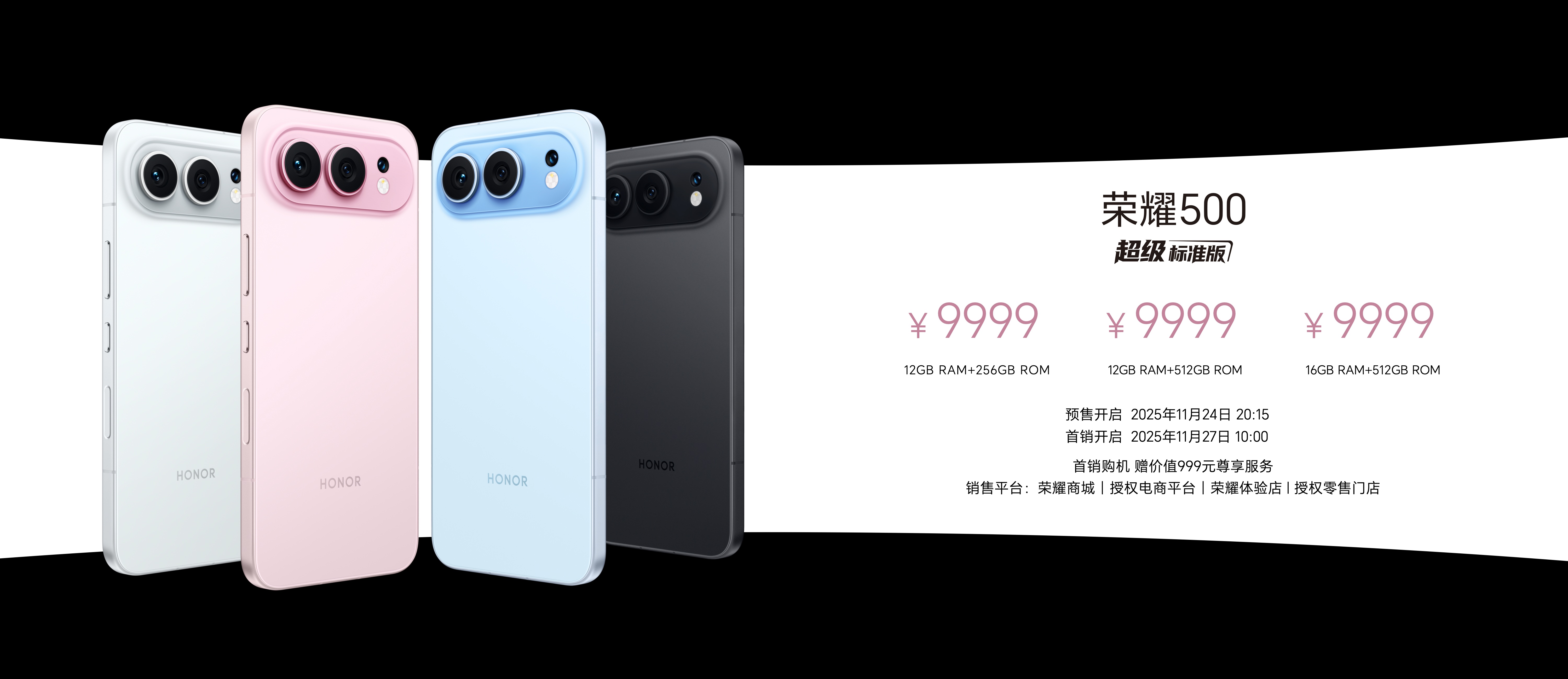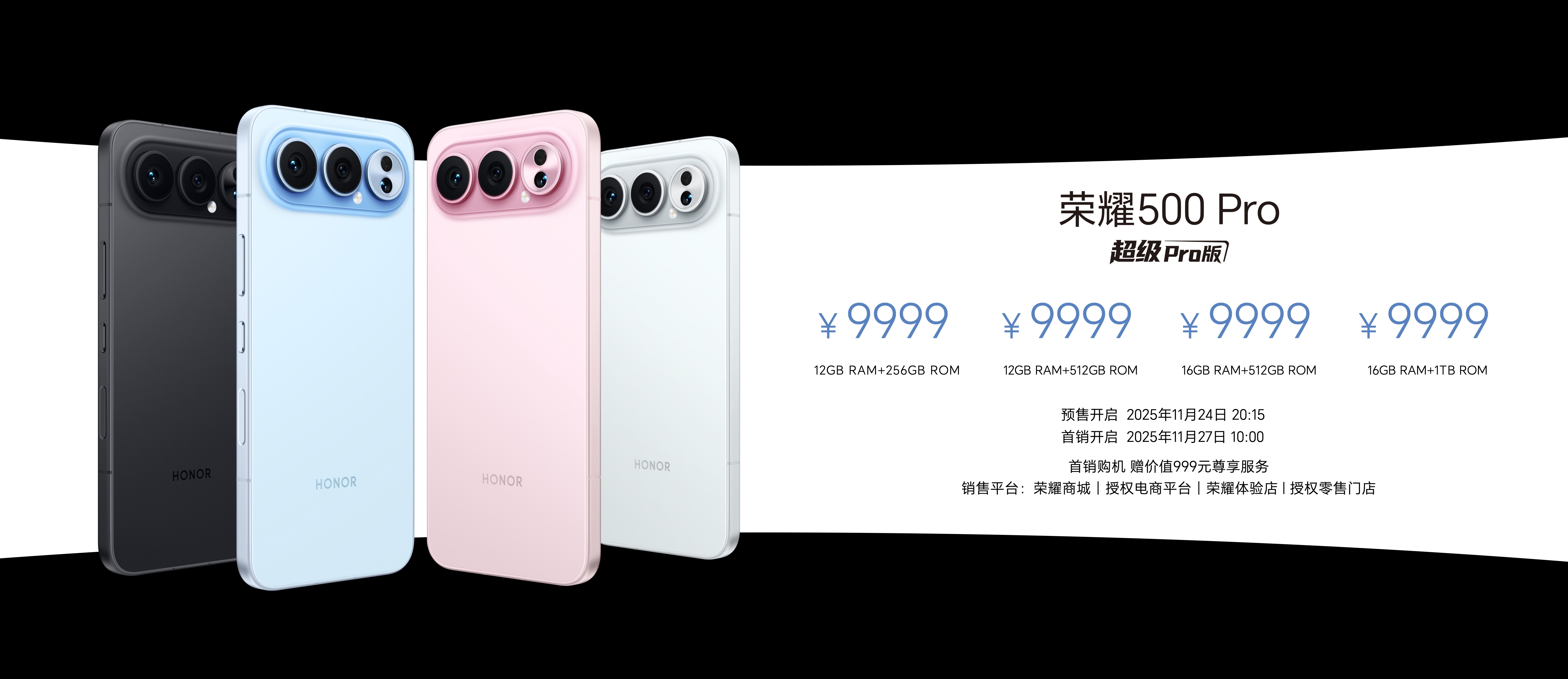 荣耀500系列共带来“海蓝宝”、“星光粉”、“月光银”、“曜石黑”4款水晶配色,售价方面,荣耀500标准版12GB+256GB、12GB+512GB和16GB+512GB版本售价分别为2699元、2999元和3299元;荣耀500 Pro版12GB+256GB、12GB+512GB、16GB+512GB和16GB+1TB版本售价分别为3599元、3899元、4199元和4799元。现已在荣耀商城、授权电商平台、荣耀体验店、授权零售门店开启预售,并于11月27日10:00正式开售,首销购机赠价值999元尊享服务。