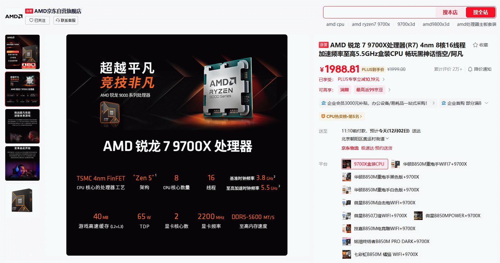 目前AMD锐龙7 9700X处理器在在京东自营旗舰店的最新报价是1999元,PLUS会员到手还能再优惠,成为京东旗舰店会员还有0元入会抽100元E卡,首购返666京豆和晒单抽AMD羽绒马甲和定制礼盒等活动。目前AMD锐龙7 9700X处理器的价格已经稳定在2000元以内,对于给处理器留有2K预算的DIY玩家们,这就是大家最值得的选择,想要2025年实现攒机愿望的朋友们,现在抓紧时间下单入手这款AMD锐龙7 9700X处理器吧