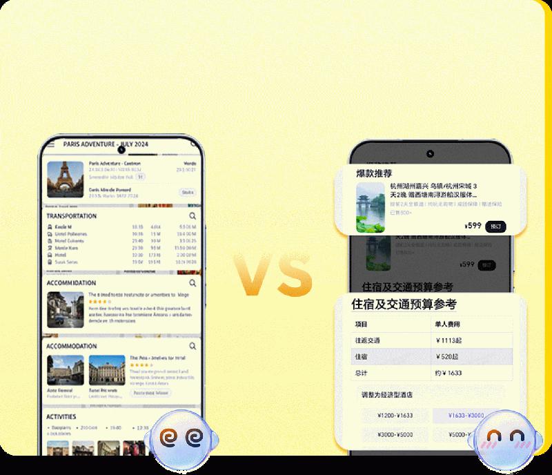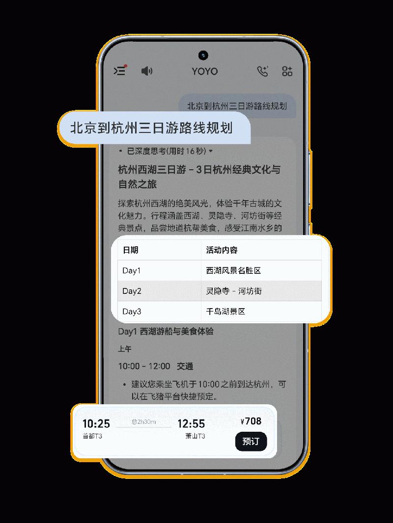 相较于传统App打开-搜索-筛选-查看的流程,如今用户则无需反复研究制定出游攻略、多平台比价,只需对YOYO说一句:“北京到杭州三日游路线规划”,它便能深度理解“短程”“小众”等用户意图,结合实时航班动态、酒店余房、景区人流数据等,分析整理出结构清晰的综合方案。如果临时想调整计划,只需告诉它:“第二天不想去西湖,有没有室内替代方案?”行程随之动态更新,灵活如私人定制。