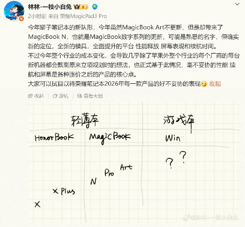 新品亮相的同时,荣耀中国区智慧生活业务部部长林林在微博上公布了2026年荣耀笔记本产品的新队形。