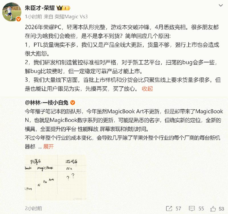 荣耀PC产品线总经理朱臣才也表示,2026年荣耀PC轻薄本队形完整,游戏本突破冲锋,将于4月系数亮相。同时,朱臣才解释了今年荣耀PC出货较晚的原因,在于产品线同时更新的芯片需求较大、荣耀相对严格的研发制造管控标准以及为了确保线下供货量充足。
