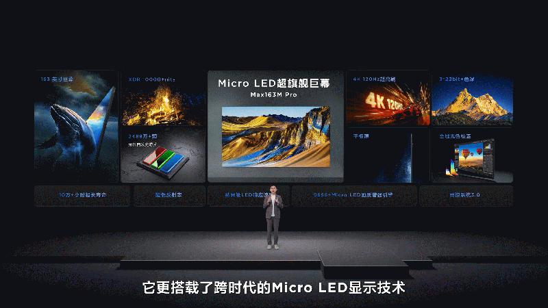“大”只是序章,其真正内核在于跨时代的Micro LED显示技术。这是使用微米级LED自发光光源排列成高密度像素阵列、每个像素都能独立发光和控光的显示技术,具有无限对比度、超高亮度、超低功耗、快速响应以及长寿命等优势,是行业公认的下一代显示技术。而Max163M Pro搭载了2488万多颗无机自发光芯片,实现真4K分辨率与像素级独立控光,画面的边缘更加锐利、清晰,使画面更加立体。由于采用无机材料,Micro LED在拥有OLED同等像素级控光能力的同时,彻底告别了烧屏隐患,10万小时以上的超长寿命让未来十年画质始终如一。