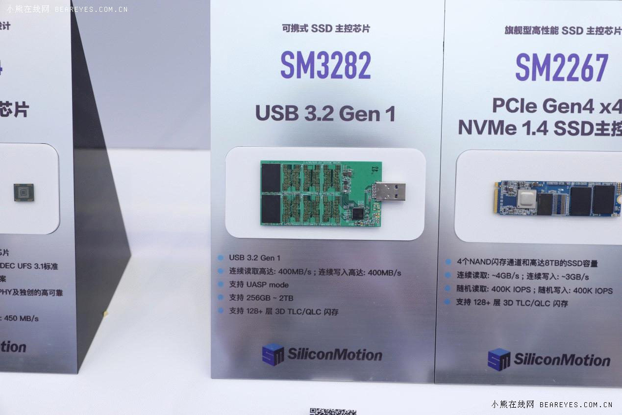 此外,慧荣还展示了全新的SM3282主控芯片,采用USB 3.2 Gen1接口,主要是为具有移动需求的高性能存储设备所设计的,连续读取和写入速度可达400MB/s以上,基本可以满足摄影摄像等需要大容量文件传输的用户需求。