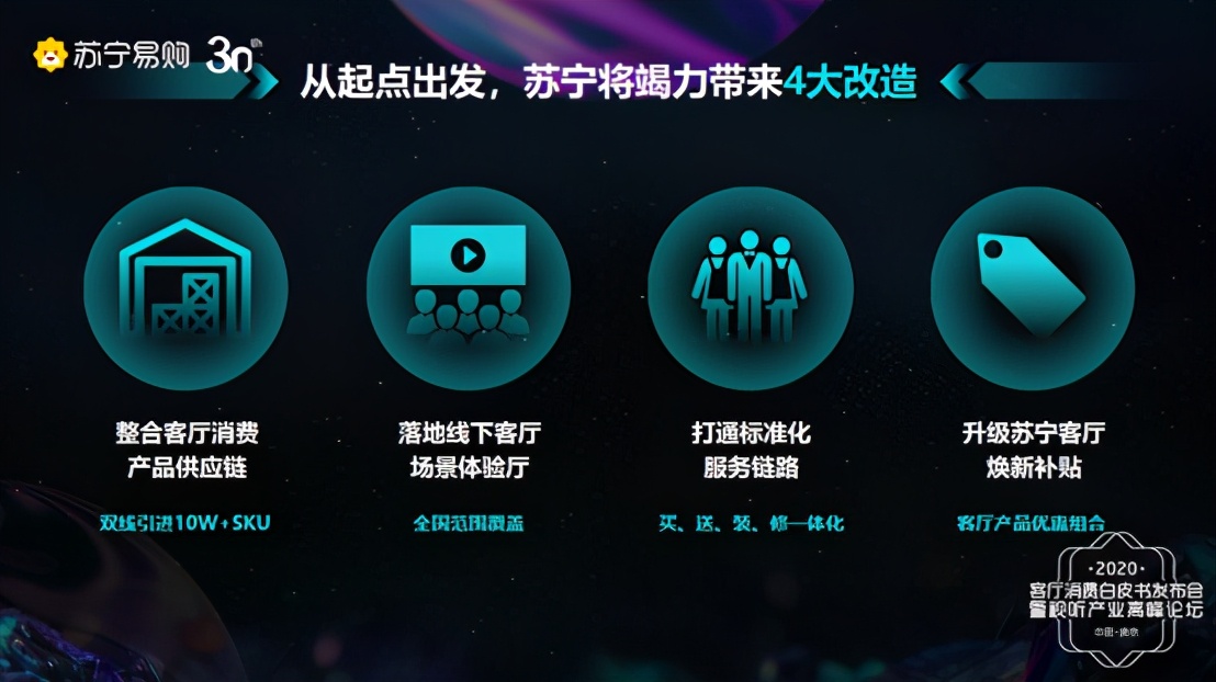 根据规划,苏宁拟将在2021年能够将新产品、新场景呈现给消费者。通过重塑客厅价值,开拓功能客厅市场增量空间,客厅消费产业联盟开放融合,客厅消费将会大放异彩。