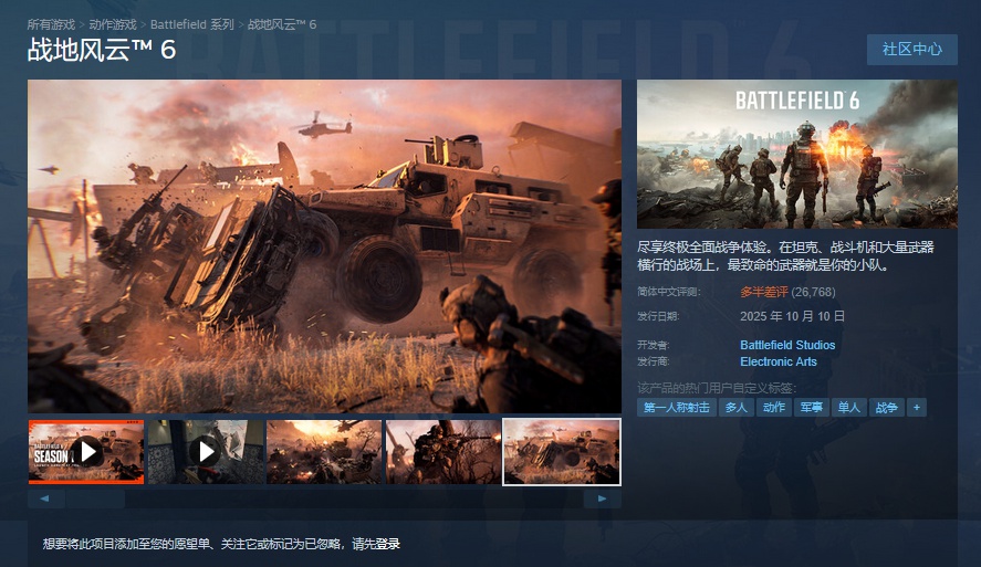 【小熊在线】说到近期最火爆的第一人称射击联机游戏,当属上个月刚刚发售的《战地风云6》了,这款由EA发行的全球知名大作续作一上线就取得了首周登顶STEAM全球销量榜第四,三天内全球销量突破700万份。