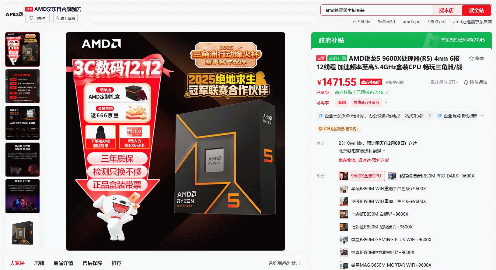 目前AMD锐龙5 9600X处理器在在京东自营旗舰店的报价是1549元,但是目前正在享受政府补贴价,到手只要1471.55元,成为京东旗舰店会员还有0元入会抽100元E卡,首购返666京豆和晒单抽AMD羽绒马甲和定制礼盒等活动。近期AMD锐龙5 9600X处理器的政府补贴价比日常售价更便宜,现在入手非常合适,对于追求性能、效率与前瞻性的用户而言,选择ZEN5+DDR5+PCIe 5.0主打的AM5平台,不仅是购买当下,更是投资未来5年的数字生活。