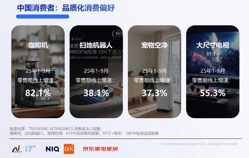 这份韧性尤其体现在消费信心与偏好的转变上。《报告》显示,中国消费者信心指数在主要经济体中表现强劲,为内需市场奠定了坚实基底。更关键的是,消费驱动的内核已从单纯的功能满足,转向由“后Z世代”、“千禧一代”、“新银发族”这“新三代”所驱动的“情绪价值经济”。消费不再只是购买物品,更是寻求身份认同、情感慰藉与生活品质的表达。无论是增速惊人的高端咖啡机、配备强劲清洁能力的扫地机器人,还是满足情感投射的宠物空净与大尺寸电视,其爆发式增长无一不证明,消费者愿意为高品质、高情感附加值的产品买单。消费主场已从“悦人”转向“悦己”,关注点回归“与我相关”的意义构建。