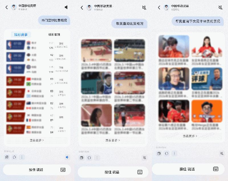 2026是体育大年,各项顶级赛事轮番登场,用户查询需求将迎来爆发,这也是检验智能体能力的典型场景——相比于手动翻查复杂赛程表、获取球队动态,用户只需打开荣耀YOYO,找到中国移动灵犀智能体,发出“查询热门赛事”指令,后台启动深度分析后,即可整合赛程、参赛球队、实时新闻等关键信息,并提供包含赛事回看、预约、精彩集锦于一体的卡片,点击可直达详情。一次对话,用户拿到的不是碎片信息,而是完整的赛事服务链路。