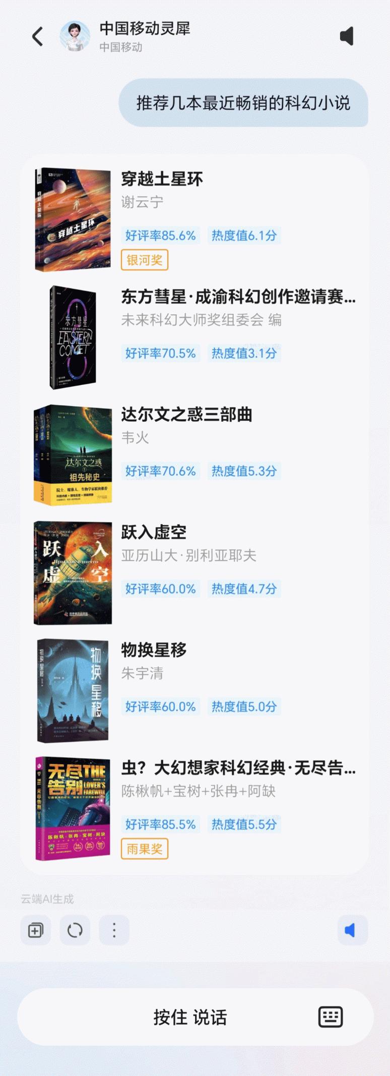 在内容场景中,体验提升同样显著——例如用户想阅读书籍小说,只需打开荣耀YOYO对话框输入相应指令,中国移动灵犀智能体能基于深度语义理解与内容知识图谱,解读核心观点并推送适合用户需求的听书播客、购书卡片等;从“种草”到“拥有”,不仅提升了用户满意度,也为业务转化创造了更多触点,推动商业价值增长。