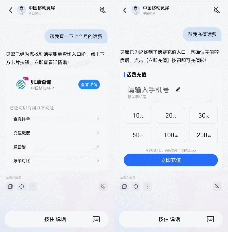 以通信场景为例,用户查询话费是典型的重复性需求,使用频次较高;在用户首次发出“查上月话费”指令后,可调出“账单查询”“充值缴费”“换套餐”等功能的荣耀YOYO聚合卡片。此后,用户无需再次输入,只需点开这张卡片,即可直接查询。长期反复的互动,可使智能体不断学习用户习惯,进而为中国移动优化套餐设计、提升内容品质提供坚实的数据支撑。