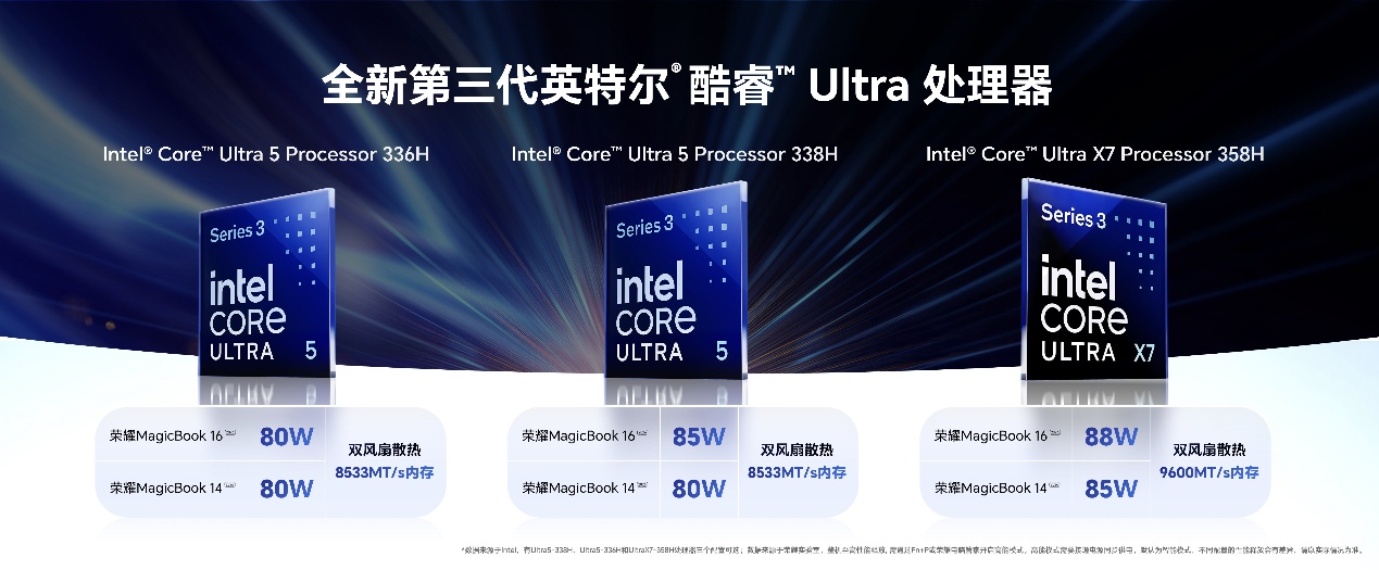 荣耀MagicBook 14|16系列2026最高搭载英特尔第三代酷睿Ultra X7处理器,依托荣耀自研HONOR Turbo X技术,可实现最高88W满功率释放,无论处理大文件处理、视频后期还是3A游戏,都可以轻松应对,实现8K档位以内同价位轻薄本性能领先;全系搭载92Wh巨量电池,15.6小时超长续航,真续航不虚标,同价位续航最强,即便匆忙出门忘带电源,也能从容满足从早八到深夜的全天使用需求,彻底告别续航焦虑,为用户带来实实在在续航与性能双强的越级体验。