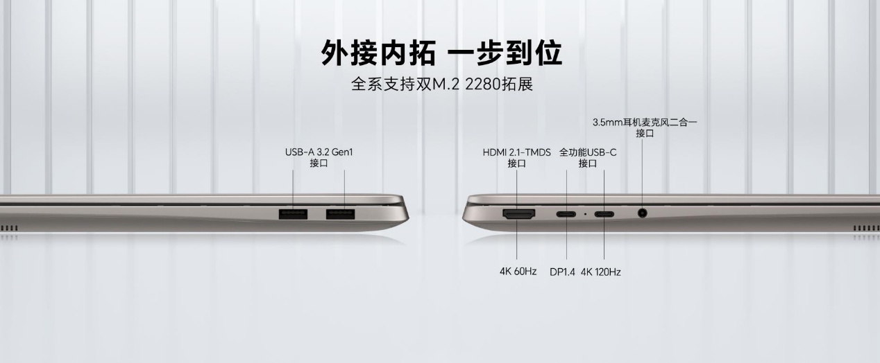 荣耀MagicBook 14|16系列2026采用轻薄优雅设计,拥有星辰灰、浮光金两款配色,荣耀MagicBook 14 2026轻至1.39kg、薄至16.5mm,荣耀MagicBook 16轻至1.69kg,薄至16.9mm。接口配置拉满,配备全功能USB-C、USB-A、HDMI及3.5mm音频接口,内置双M.2 2280存储插槽方便扩展升级,兼顾轻薄便携与全场景拓展需求,彻底告别接口与容量焦虑。
