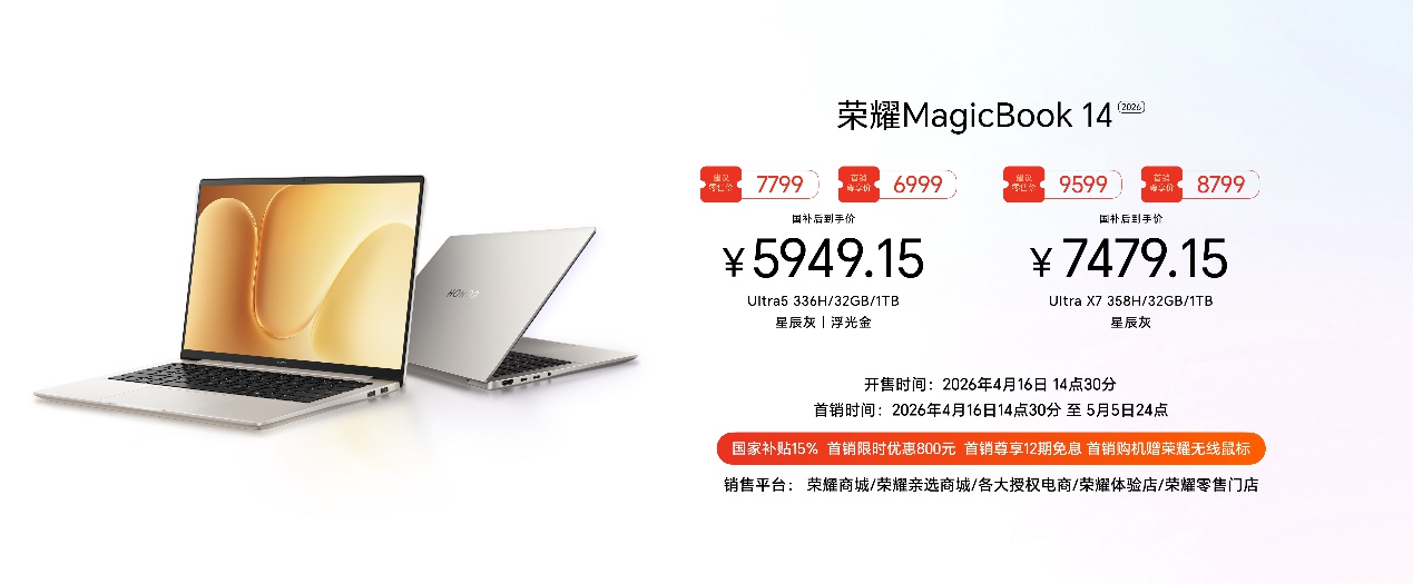 4月荣耀PC家族迎来大爆发,除本次正式发布的行业首款“养虾本”荣耀MagicBook 14|16系列2026外,“赢者通吃”的全新荣耀WIN系列旗舰游戏本、行业续航最长的荣耀MagicBook Pro系列,以及品质过硬的荣耀笔记本 X Plus系列新品也将于4月23日发布。荣耀MagicBook 14 2026国补价5949.15元起售,将于2026年4月16日14点30分,荣耀商城/荣耀亲选商城/各大授权电商/荣耀体验店/授权零售门店各大官方渠道正式开售。